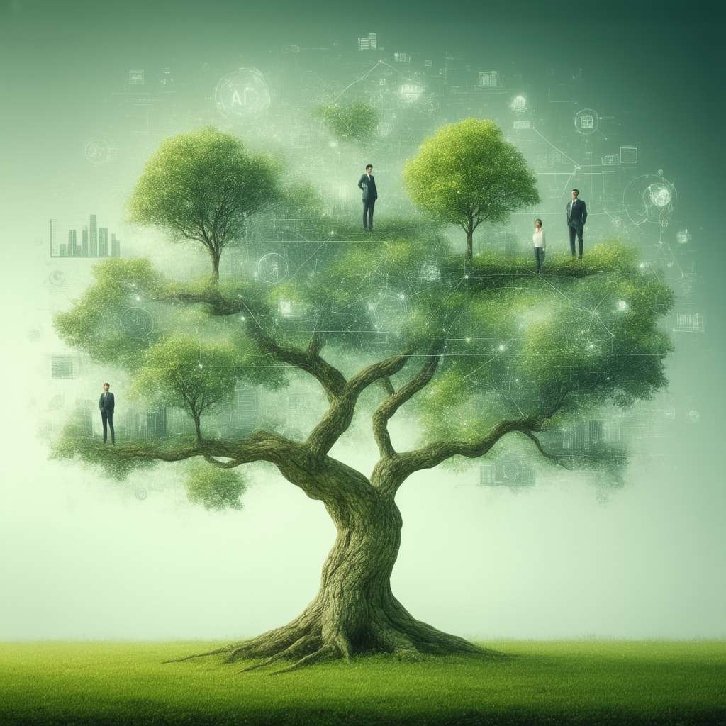 3. Un albero stilizzato con radici profonde e rami che si estendono verso l’alto:* Simboleggia la crescita di nuove competenze e opportunità nel settore dell’IA. Le foglie dell’albero sono formate da simboli di codice binario.
